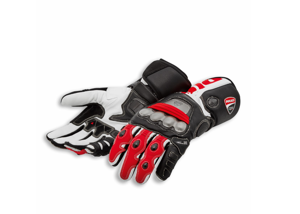 Exclusive gloves, developed in partnership with Dainese, specific for use on the track. Top performance thanks to an excellent fit, which offers the rider superior sensitivity on the controls, for a perfect grip. The sheepskin, reinforced on the palm, provides a high level of protection, further optimized by the four-way stretch fabric between the knuckles and the back of the hand. CE certified, for maximum protection, the gloves are equipped with DCP system on the little finger and composite inserts in carbon fibre and titanium on the knuckles and back of the hand, and in thermoplastic resin on the side of the little finger. The joints of the fingers and the head of the ulna bone are protected by carbon fibre inserts. The gloves' comfort is also first-rate thanks to the soft, elastic inserts, the adjustable band on the cuff, and the Super Touch sheepskin palm, which together with the pre-curved structure of the fingers and wrist offer the rider an optimal feeling. The covered anti-slip strap completes the design, further improving comfort. The excellent technical characteristics combine with an eye-catching design featuring the iconic Ducati colours to give these gloves an aggressive look while allowing you to push yourself to the max and transform every outing into pure emotion.