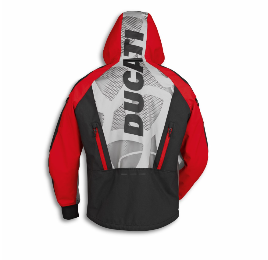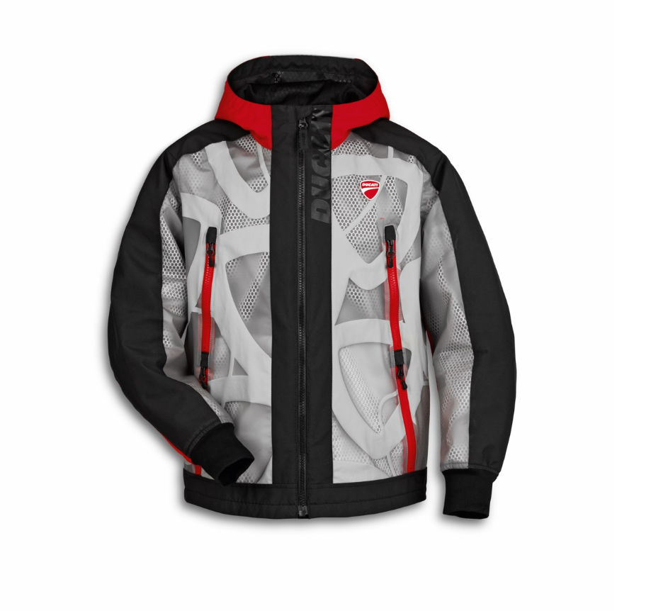 The unmistakable design of Drudi Performance combines with Spidi performance in a special project developed exclusively for Ducati to create the modern Ducati Overlay YO fabric jacket, a waterproof and windproof garment that makes style and modularity its strengths. The exterior is made of clear polyurethane and two-layer polyester, while the 3D mesh lining features 80% perforated surface area to improve breathability. Thermal comfort is further enhanced by the large air vents on the body and underarms. It can also be worn alone as a leisure jacket, and can easily be combined with the bodysuit with the Overlay P01 protectors for use on motorcycles. It can also be combined with the thermal Overlay Sweatshirt L01 because of the central connecting zipper and the toggles on the back of the neck and cuffs. Available only in a male fit, it is an exclusive jacket with a meticulous aesthetic that does not disappoint when it comes to performance and comfort.